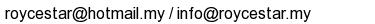 Description :  Company Particular| Company : | ROYCESTAR INNOVTECH SDN BHD | | Fax : | 07-5588252 | | Address : | 28-A, Jalan Ronggeng 12, Taman Skudai Baru, 81300 Skudai, Johor, Malaysia. | | Email : |  | | Website : | http://roycestar.my |