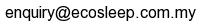 Company Particular| Company : | Ecosleep Sdn Bhd | | Fax : | 07 863 6593 | | Address : | 6, Jalan Istimewa 1, Taman Desa Cemerlang, 81800 Ulu Tiram, Johor | | Email : |  | | Website : | http://ecosleep.com.my |